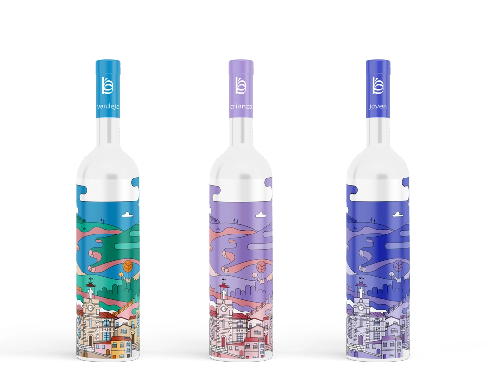 Desarrollé el packaging para la colección de vinos de Vinos Borbón (joven, crianza y blanco), centrando la identidad visual en una ilustración del pueblo de origen, Fermoselle (Zamora), que facilita la identificación del producto. La misma ilustración se adapta a cada variedad mediante diferenciación cromática según distintos momentos del día: blanco (día), crianza (atardecer) y joven (noche). Con un estilo minimalista y colores planos, la propuesta logra un conjunto armonioso y equilibrado donde cada elemento mantiene su espacio, reforzando la coherencia visual de la colección.